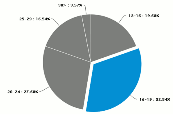 - Ages cohort completed the survey as follows: 16-19 (32.31%), 20-24 (29.68%,), 13-16 (20.29% )and 25-29 (15.95% ) [See Figure 1]